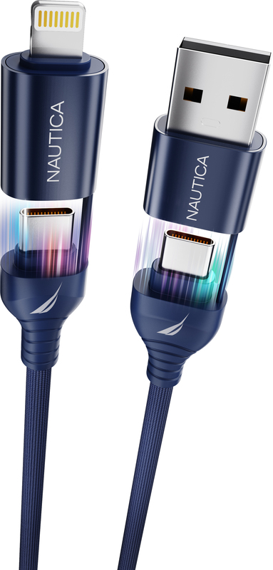 The Nautica CB405 is your all-in-one charging and syncing solution, designed to simplify your tech life and make it more efficient. This MFi-certified 4-in-1 cable combines USB-C, USB-A to Lightning, and Type-C PD support into a single sleek and compact design. Whether you need to charge your phone, tablet, laptop, or wireless earbuds, this cable has you covered—no need to carry multiple cables anymore.