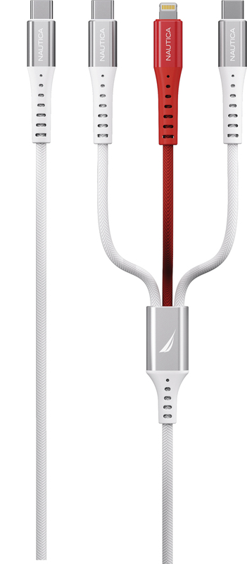 Meet the Nautica CB630 USB C to Lightning + Type C + Type C cable—your ultimate 3-in-1 charging powerhouse. This cable lets you charge THREE devices at once, keeping your phone, tablet, laptop, and wireless earbuds powered up without the hassle of multiple cables. With 60W Power Delivery, the CB630 delivers lightning-fast charging for all your devices. Plus, with high-speed 480 Mbps data transfer, syncing your files is faster than ever. Crafted with sleek aluminum inputs and outputs, combined with premium woven fabric, this cable is built to last while looking stylish. Fully compatible with all USB-C devices, including iPhones (with Lightning port), tablets, laptops, and more, the CB630 is designed for those who want efficiency, durability, and style in one sleek package.