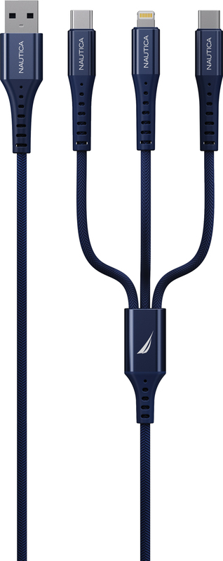 The Nautica CB640 USB A to Lightning + 2 Type C Outputs cable is the ultimate 3-in-1 solution for charging all your devices at once. Charge your phone, tablet, laptop, or wireless earbuds simultaneously with just one cable. With 15W Power Delivery across the Type-C outputs and 12W from the USB-A to Lightning port, the CB640 delivers fast and reliable charging for all your devices. It also supports high-speed data transfer up to 480 Mbps for your Lightning devices, ensuring seamless syncing of photos, videos, and documents. Crafted with aluminum inputs and outputs, combined with a premium woven fabric cover, the CB640 offers a stylish, durable, and tangle-free solution for all your charging needs. Compatible with a wide range of USB-C and Lightning-enabled devices, including iPhones, tablets, laptops, and more.
