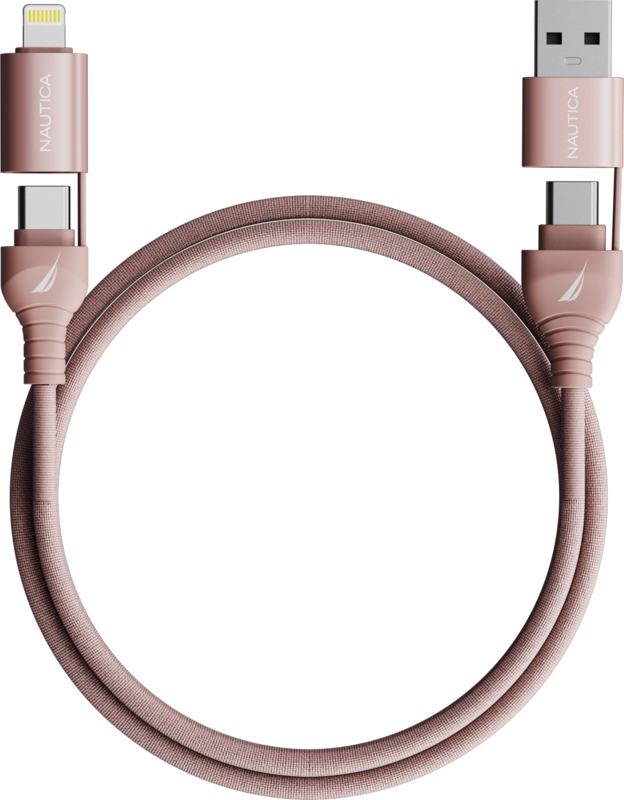 The Nautica CB400 is a MFi Certified 4-in-1 cable designed to simplify your charging and syncing needs. With a sleek design, it combines USB C, USB A to Lightning, and Type C PD support all in one cable. Say goodbye to clutter and carry just one cable for all your devices, whether it's your phone, tablet, laptop, or wireless earbuds. With 100W maximum power*, it charges your devices quickly and efficiently, offering ultimate convenience. The premium woven fabric cover and high-quality aluminum connectors ensure durability and style, making it the perfect companion for any tech enthusiast.