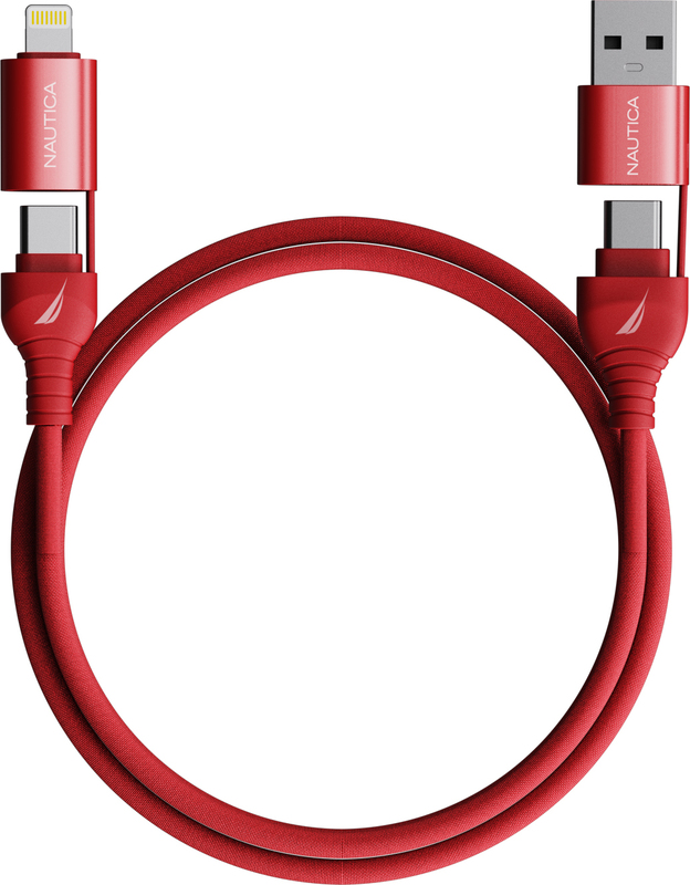 The Nautica CB400 is a MFi Certified 4-in-1 cable designed to simplify your charging and syncing needs. With a sleek design, it combines USB C, USB A to Lightning, and Type C PD support all in one cable. Say goodbye to clutter and carry just one cable for all your devices, whether it's your phone, tablet, laptop, or wireless earbuds. With 100W maximum power*, it charges your devices quickly and efficiently, offering ultimate convenience. The premium woven fabric cover and high-quality aluminum connectors ensure durability and style, making it the perfect companion for any tech enthusiast.
