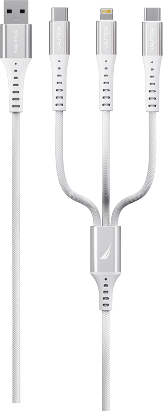 The Nautica CB640 USB A to Lightning + 2 Type C Outputs cable is the ultimate 3-in-1 solution for charging all your devices at once. Charge your phone, tablet, laptop, or wireless earbuds simultaneously with just one cable. With 15W Power Delivery across the Type-C outputs and 12W from the USB-A to Lightning port, the CB640 delivers fast and reliable charging for all your devices. It also supports high-speed data transfer up to 480 Mbps for your Lightning devices, ensuring seamless syncing of photos, videos, and documents. Crafted with aluminum inputs and outputs, combined with a premium woven fabric cover, the CB640 offers a stylish, durable, and tangle-free solution for all your charging needs. Compatible with a wide range of USB-C and Lightning-enabled devices, including iPhones, tablets, laptops, and more.